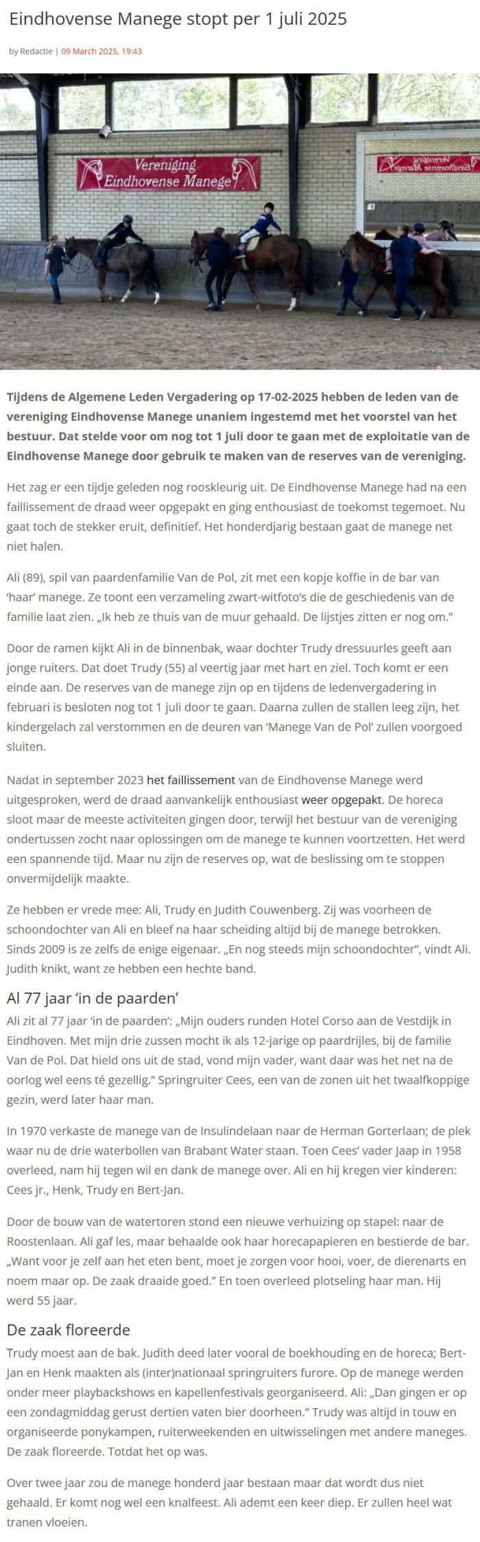 | 5 mrt 2025 | Doek valt definitief voor manege | Eindhovens Dagblad | |